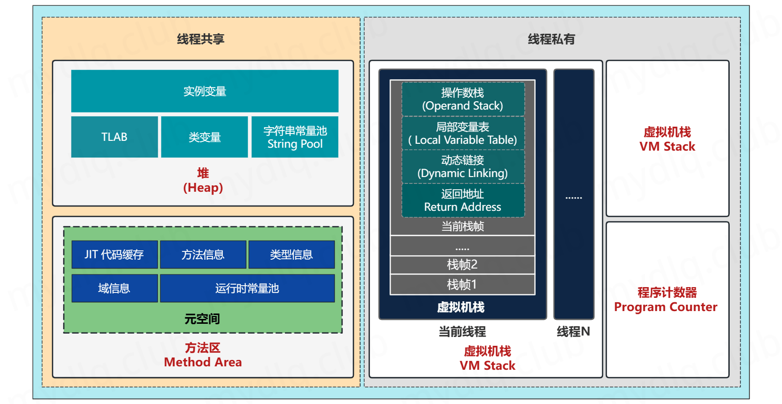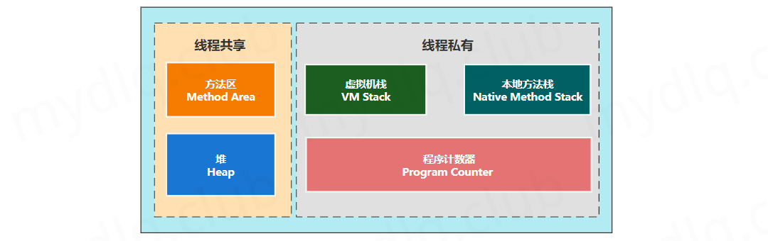- 线程私有: 程序计数器、虚拟机栈、本地方法栈