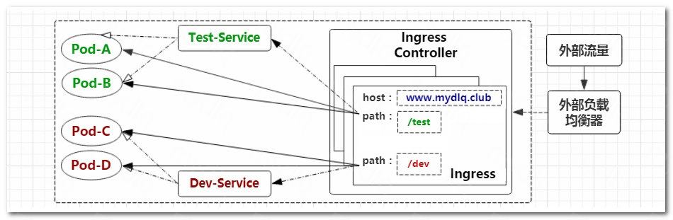 例如下图,展示了集群外部客户端通过 Ingress 地址访问集群,根据配置的 Ingress 规则,将所有访问 host 为 www.mydlq.club ,且 path 为 “/test” 或者 “/dev” 的外部流量转发到对应的 Pod 上。