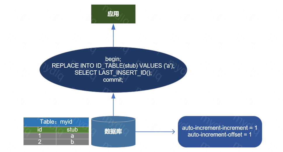 begin;REPLACE INTO `myid`(stub) VALUES ('a');SELECT LAST_INSERT_ID();commit;等取到 ID 值后我们在让其与”时间戳”、“随机值”、“业务码”等组合,生成与业务挂钩的分布式 ID 串,一般时候我们生成的串都不会超过 64 位,以方便用 long 类型存储该串;