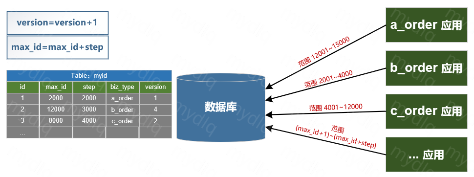 CREATE TABLE `myid` ( id int(10) NOT NULL AUTO_INCREMENT, max_id bigint(20) NOT NULL, step int(20) NOT NULL, biz_type int(20) NOT NULL, version int(20) NOT NULL, PRIMARY KEY (`id`))- max_id:当前最大可用 ID。