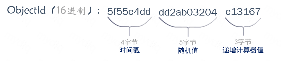 在 MongoDB 中默认生成的 ObjectId(十六进制)是由一个 12bit 组成的BSON,ObjectID 是一个 12bit 的 BSON 类型数据,组成类似于雪花算法,如下图就是一个 ObjectID 的组成图: