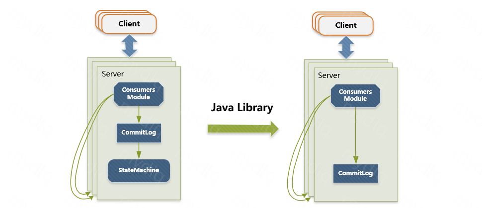 Raft 协议是复制状态机的实现,这种模型应用到消息系统中就会存在问题。对于消息系统来说,它本身是一个中间代理,commitlog 状态是系统最终状态,并不需要状态机再去完成一次状态构建。因此 DLedger 去掉了 raft 协议中状态机的部分,但基于raft协议保证commitlog 是一致的,并且是高可用的。