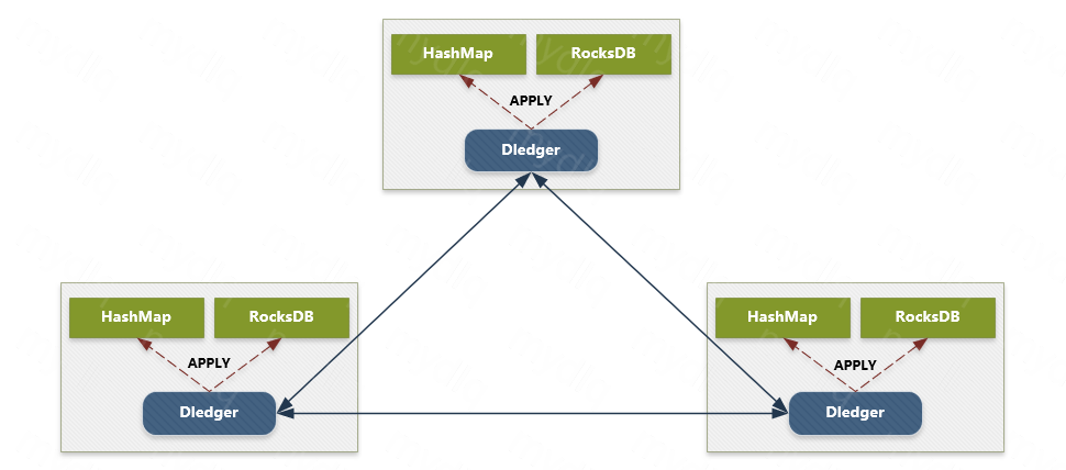 DLedger 还可以构建高可用的嵌入式 KV 存储。我们把对一些数据的操作记录到 DLedger 中,然后根据数据量或者实际需求,恢复到hashmap 或者 rocksdb 中,从而构建一致的、高可用的 KV 存储系统,应用到元信息管理等场景。